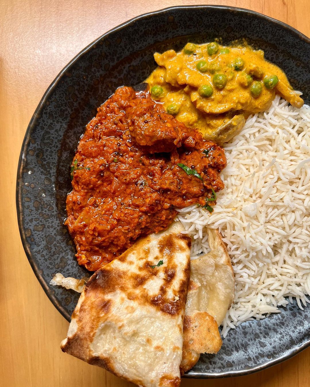 Som človek, ktorý rád skúša nové jedlá, nové chute, nové hocičo, no čo sa týka indickej kuchyne, som skôr konzervatívny. Včera som si ale tak hovoril, že je načase vystúpiť z komfortnej bezpečnej zóny a konečne tam zadrieť nejakú baraninu resp. jahňacinu🐏 Madras Mutton milo prekvapil, mäsko bolo jemnešie ako som čakal, chuť výrazne dotvárali horčicové semiačka, aj fajne vyštípalo🥵 Samozrejme som si naložil niečo málo aj z Mushroom Mutter a nejde mi konštatovať nič iné, len že objednať si zakaždým 1 mäsité a 1 veggie indické jedlo je vždy perfektná kombinácia👌🏼 Mimochodom, cesnakový naan bol asi najlepší, aký som zatiaľ mal. Neviem či sme mali šťastie na čerstvo upečený naan, alebo je taký vždy, no tie tmavšie “pripálené” časti v kombínacii s teplým nadýchaným cestom a jemným cesnakovo-olejovým poterom, ach mamo... Veľmi dobré!🤤 Oplatilo sa skúsiť niečo nové☺️